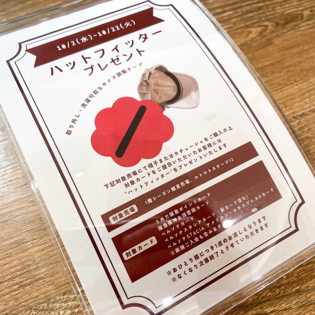 ※期間中、阪急阪神の対象カードをご提示いただいたお客様には「ハットフィッター」を1点プレゼントいたします。